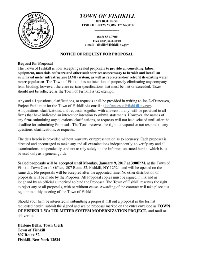 TOWN OF FISHILY 807 ROUTE 52 FISHILY NEW YORK 125243110 ___ (845) 8317800 FAX (845) 8316040 email: bells×fishily.notice OF REQUEST FOR PROPOSAL Request for Proposal The Town of Fish kill is now accepting
