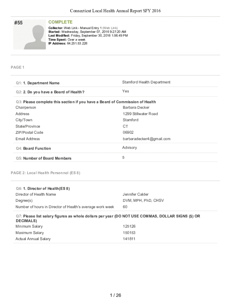 Connecticut Local Health Annual Report SAY 2016×55COMPLETE Collector: Web Link Manual Entry 1 (Web Link) Started: Wednesday, September 07, 2016 9:27:20 AM Last Modified: Friday, September 30, 2016