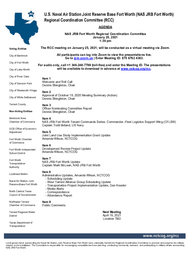 U.S. Naval Air Station Joint Reserve Base Fort Worth (NAS JOB Fort Worth) Regional Coordination Committee (RCC) AGENDA NAS JOB Fort Worth Regional Coordination Committee January 25, 2021 1:30 pm Voting