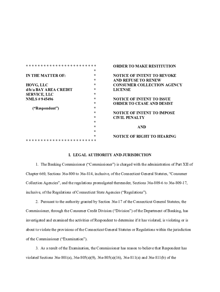 ************************ * IN THE MATTER OF: * * HOG, LLC * d/b/a BAY AREA CREDIT * SERVICE, LLC * NLS # 945496 * * (Respondent) * * * * * * * ************************ORDER Making RESTITUTION NOTICE