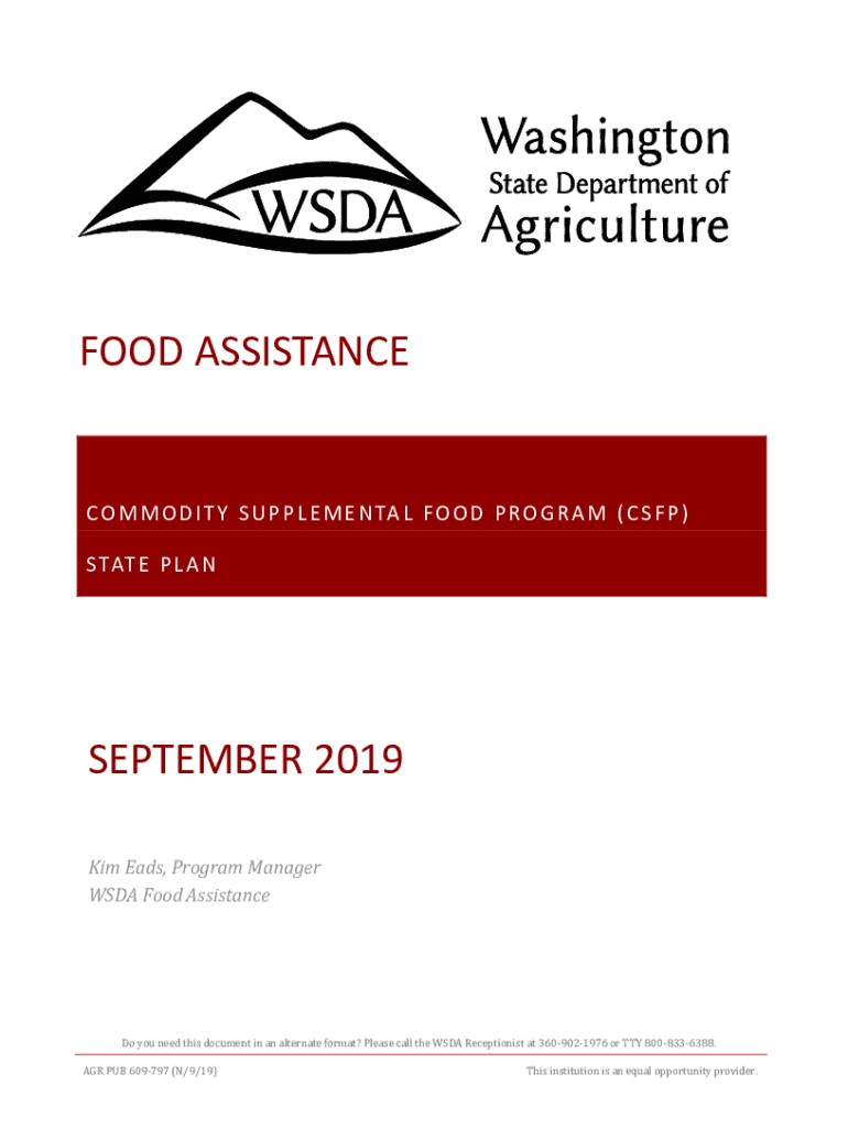 FOOD ASSISTANCE O M M O D I T Y S U P P L E M E N TA L F O O D P R O G R A M (C S F P) S TAT E P L A SEPTEMBER 2019 Kim EADS, Program Manager USDA Food Assistance you need this document in an alternate