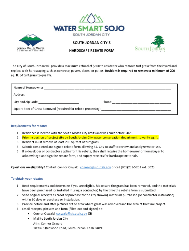 SOUTH JORDAN CITY HARDSCAPE REBATE Forth City of South Jordan will provide a maximum refund of $500 to residents who remove turfgrass from their yard and replace with landscaping such as concrete,