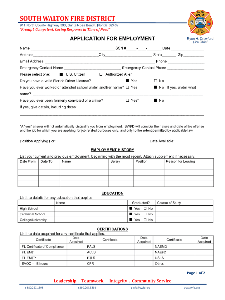 SOUTH WALTON FIRE DISTRICT 911 North County Highway 393, Santa Rosa Beach, Florida 32459Prompt, Competent, Caring Response in Time of Reapplication FOR EMPLOYMENT Ryan H. Crawford Fire Chieftain ___
