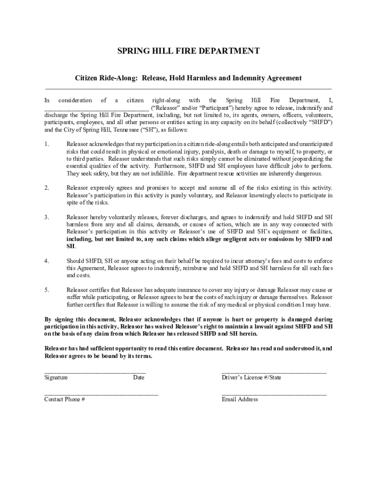 SPRING HILL FIRE DEPARTMENT Citizen Sidelong: Release, Hold Harmless and Indemnity Agreement___ In consideration of a citizen right along with the Spring Hill Fire Department, I, ___ (Releaser and/or