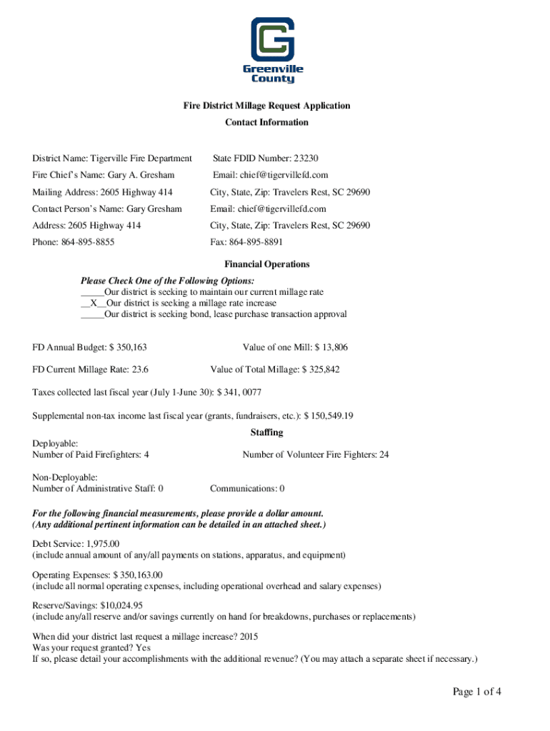 Obtain the necessary forms from the Tigerville Fire Department office or their website.