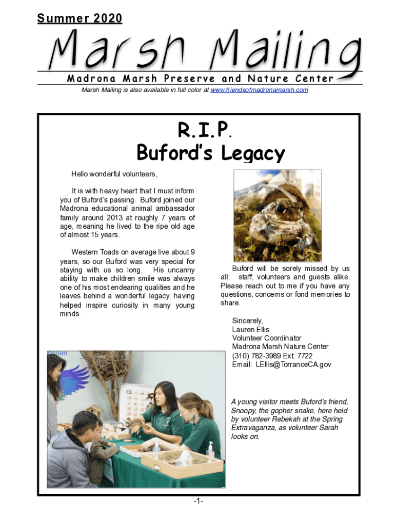 Summer 2020Marsh Mailing Madroño Marsh Preserve and Nature Center Marsh Mailing is also available in full color at www.friendsofmadronamarsh.comR. I.P. Buford's Legacy Hello wonderful volunteers,