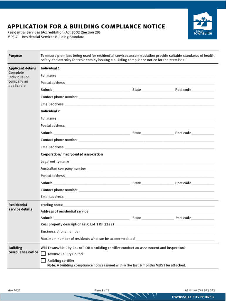 Application for a building compliance notice Residential Services (Accreditation) Act 2002 (Section 29) MP5.7 Residential Services Building StandardPurposeTo ensure premises being used for residential