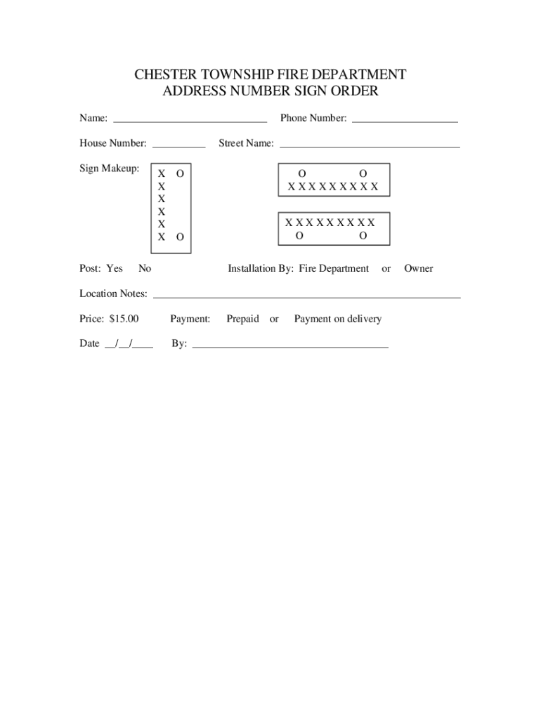 CHESTER TOWNSHIP FIRE DEPARTMENT ADDRESS NUMBER SIGN ORDER Name: ___ House Number: ___ Sign Makeup:Post: Street Name: ___X O × × × × X Homophone Number: ___O XXXXXXXXX O Installation By: Fire
