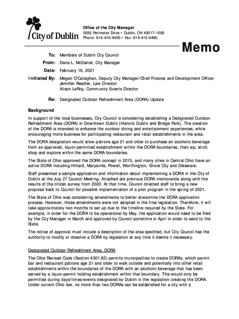 Office of the City Manager 5555 Perimeter Drive Dublin, OH 430171090 Phone: 6144104400 Fax: 6144104490To: Members of Dublin City CouncilMemoFrom: Dana L. McDaniel, City Manager Date: February 16,