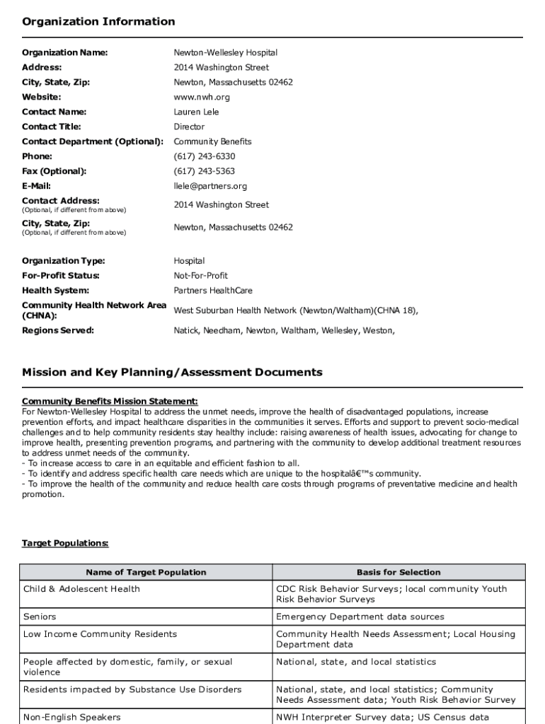 OrganizationInformation Organizational:NewtonWellesleyHospitalAddress:2014WashingtonStreetCity,State, Zip:Newton, Massachusetts 02462Website:www.nwh.orgContactName:LaurenLeleContactTitle:DirectorContactDepartment(Optional):CommunityBenefitsPhone:(617)2436330Fax(Optional):(617)2435363EMail:allele×partners.orgContactAddress:2014WashingtonStreet(Optional,
