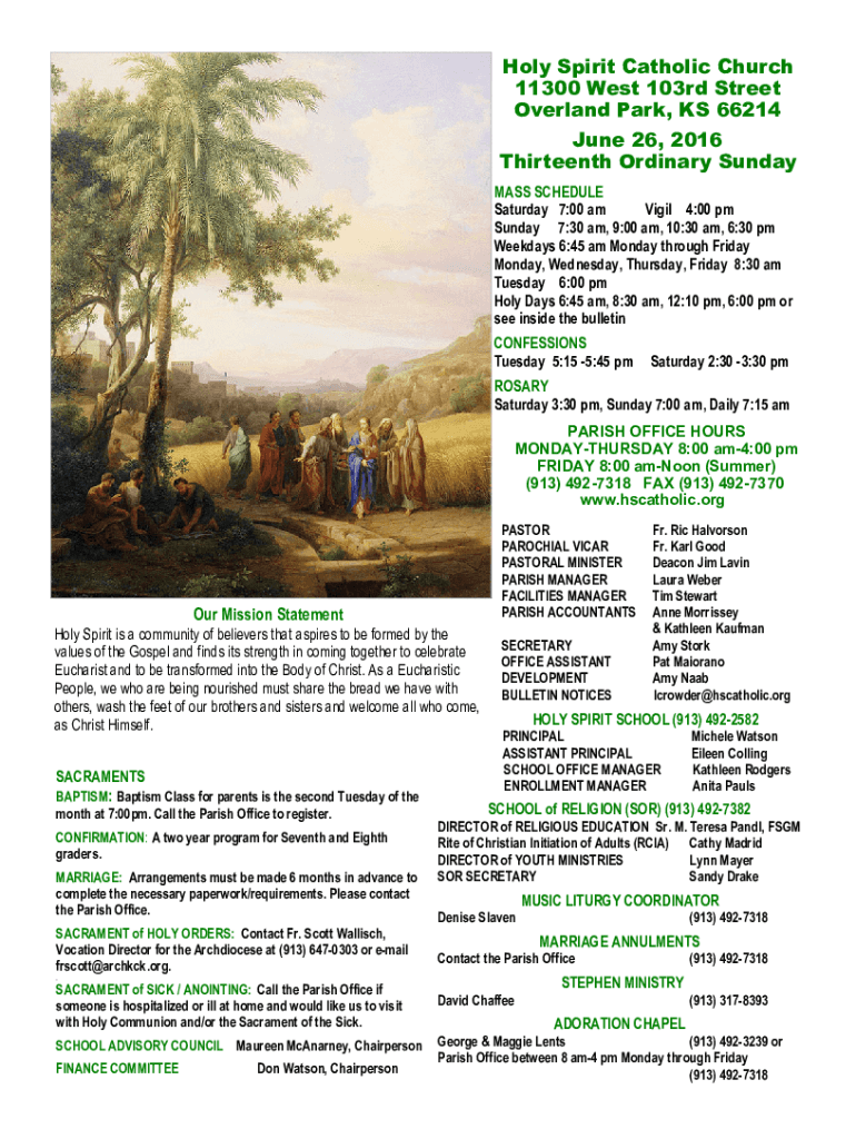 Holy Spirit Catholic Church 11300 West 103rd Street Overland Park, KS 66214 June 26, 2016, Thirteenth Ordinary Sunday MASS SCHEDULE Saturday 7:00 am Vigil 4:00 pm Sunday 7:30 am, 9:00 am, 10:30 am,