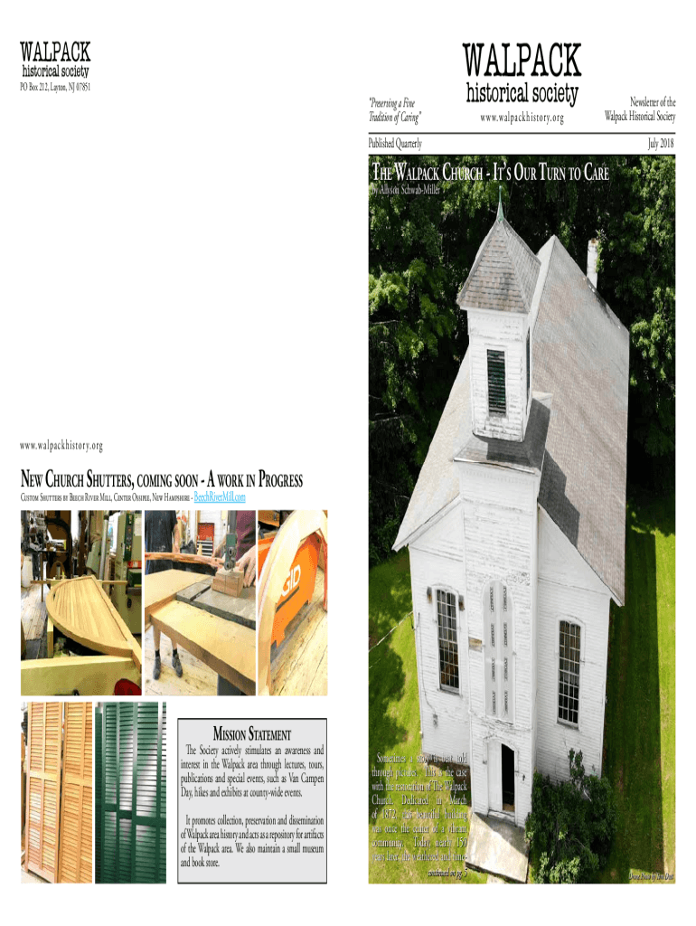 PO Box 212, Layton, NJ 07851Preserving a Fine Tradition of Caring w. w an l p a c k h i s t o r y. o r newsletter of the Wallace Historical SocietyPublished Quarterly July 2018The Wallace Church It's