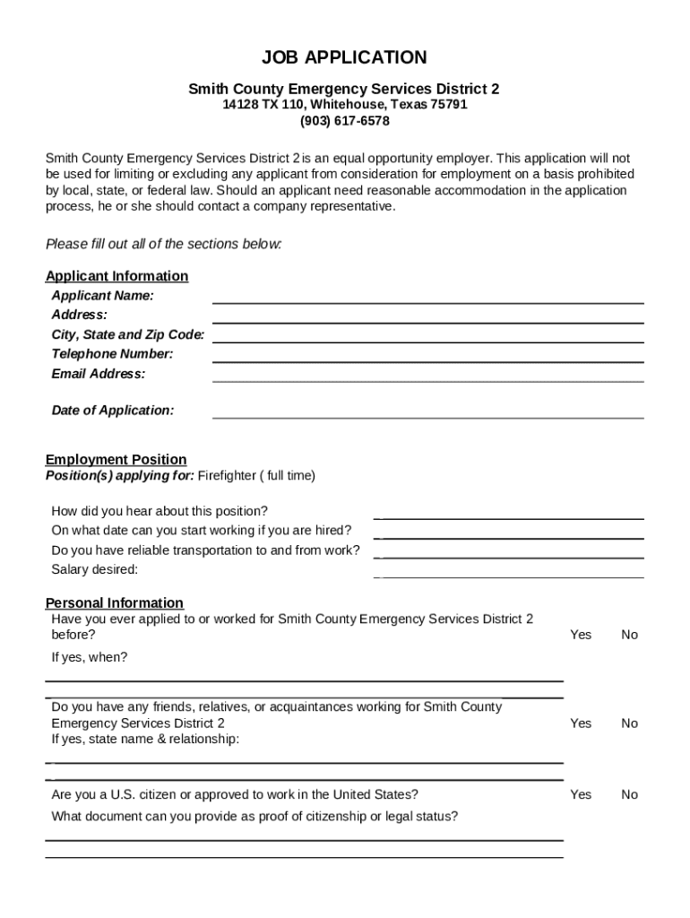 JOB APPLICATION Smith County Emergency Services District 2 14128 TX 110, Whitehorse, Texas 75791 (903) 6176578 Smith County Emergency Services District 2 is an equal opportunity employer. This application