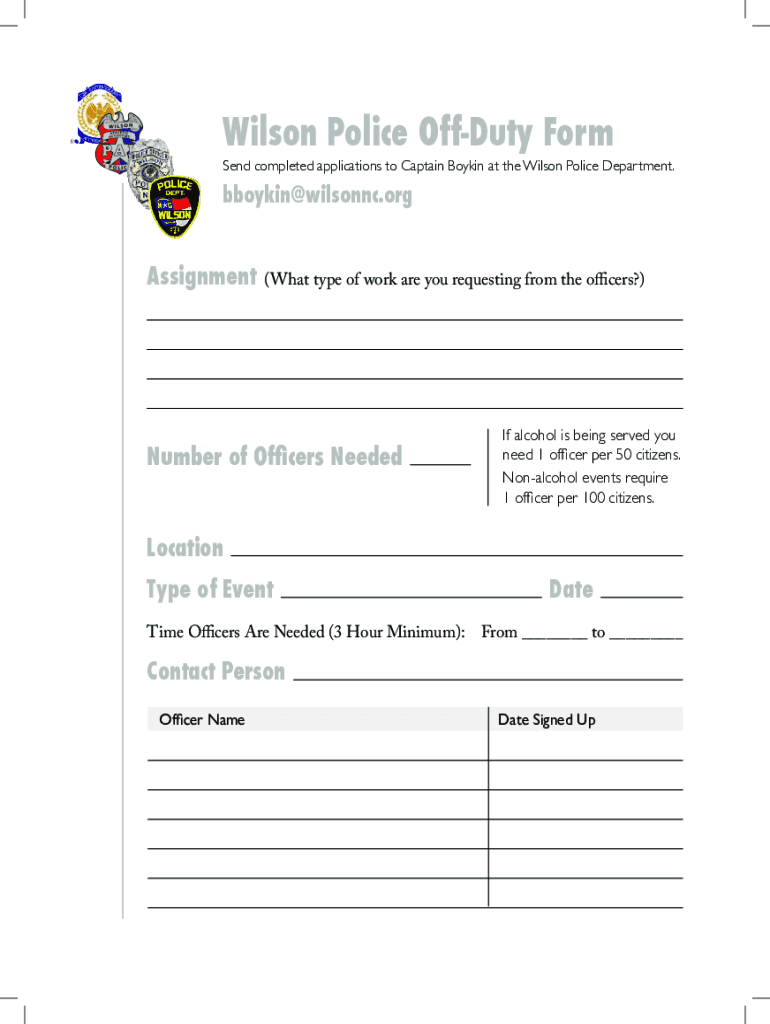 Wilson Police Duty Form Send completed applications to Captain Bodkin at the Wilson Police Department. From requesting frombboykin×Wilson.reassignment(What type of work are you requesting from the