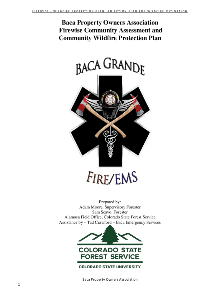 FireWire WILDFIRE PROTECTION PLAN: AN ACTION PLAN FOR WILDFIRE MITIGATIONBaca Property Owners Association Fire wise Community Assessment and Community Wildfire Protection Unprepared by: Adam Moore,