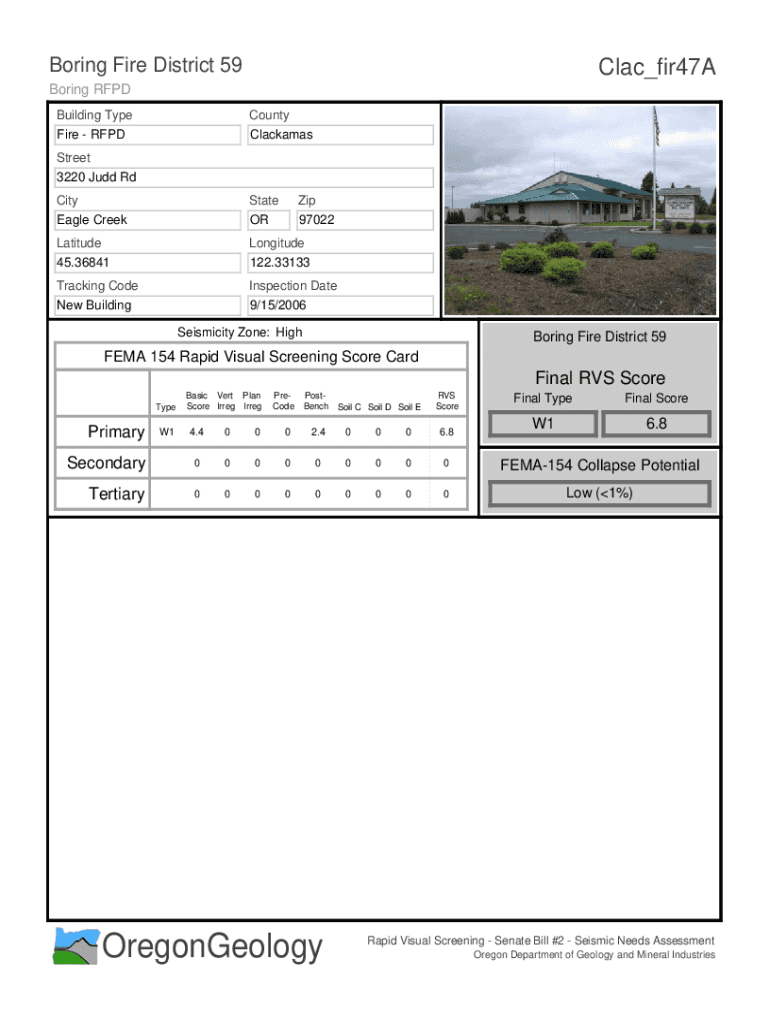 Boring Fire District 59Clac×fir47ABoring RFID Building TypeCountyFire RFPDClackamasStreet 3220 Judd Rd CityStateZipEagle CreekOR97022LatitudeLongitude45.36841122.33133Tracking CodeInspection Datebook