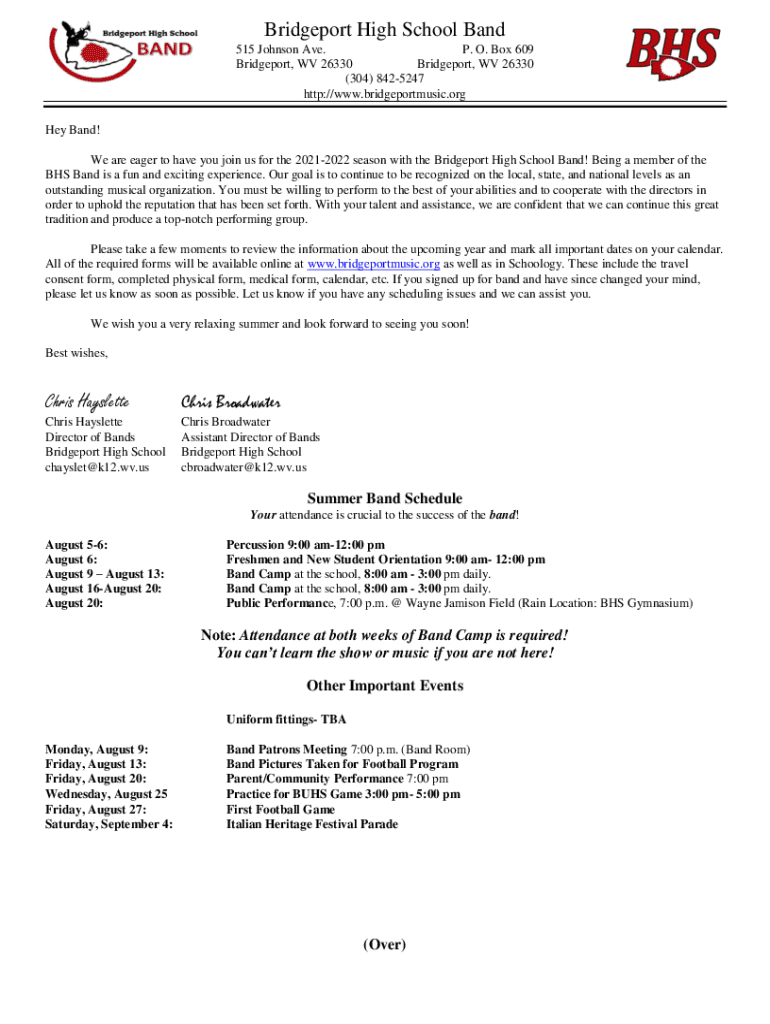 Bridgeport High School Band 515 Johnson Ave. P. O. Box 609 Bridgeport, WV 26330 Bridgeport, WV 26330 (304) 8425247 http://www.bridgeportmusic.org Hey Band! We are eager to have you join us for the