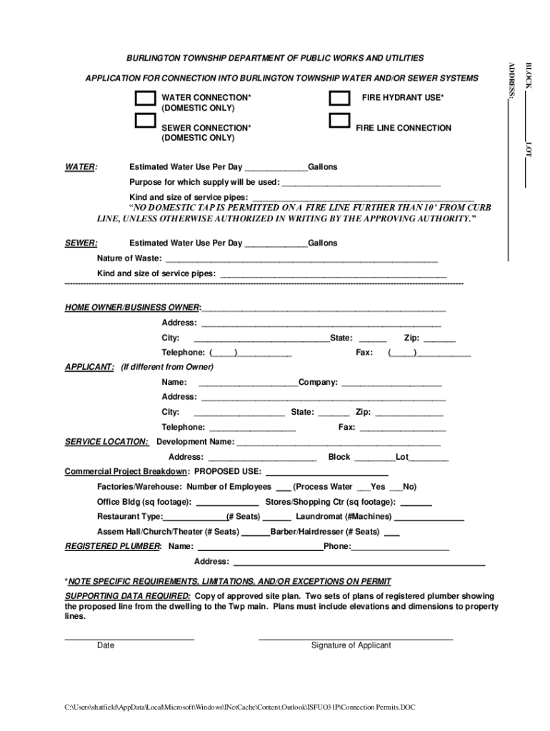 FIRE HYDRANT USE×SEWER CONNECTION* (DOMESTIC ONLY)FIRE LINE CONNECTION LATER:WATER CONNECTION* (DOMESTIC ONLY)Estimated Water Use Per Day ___Gallons Purpose for which supply will be used: ___ Kind