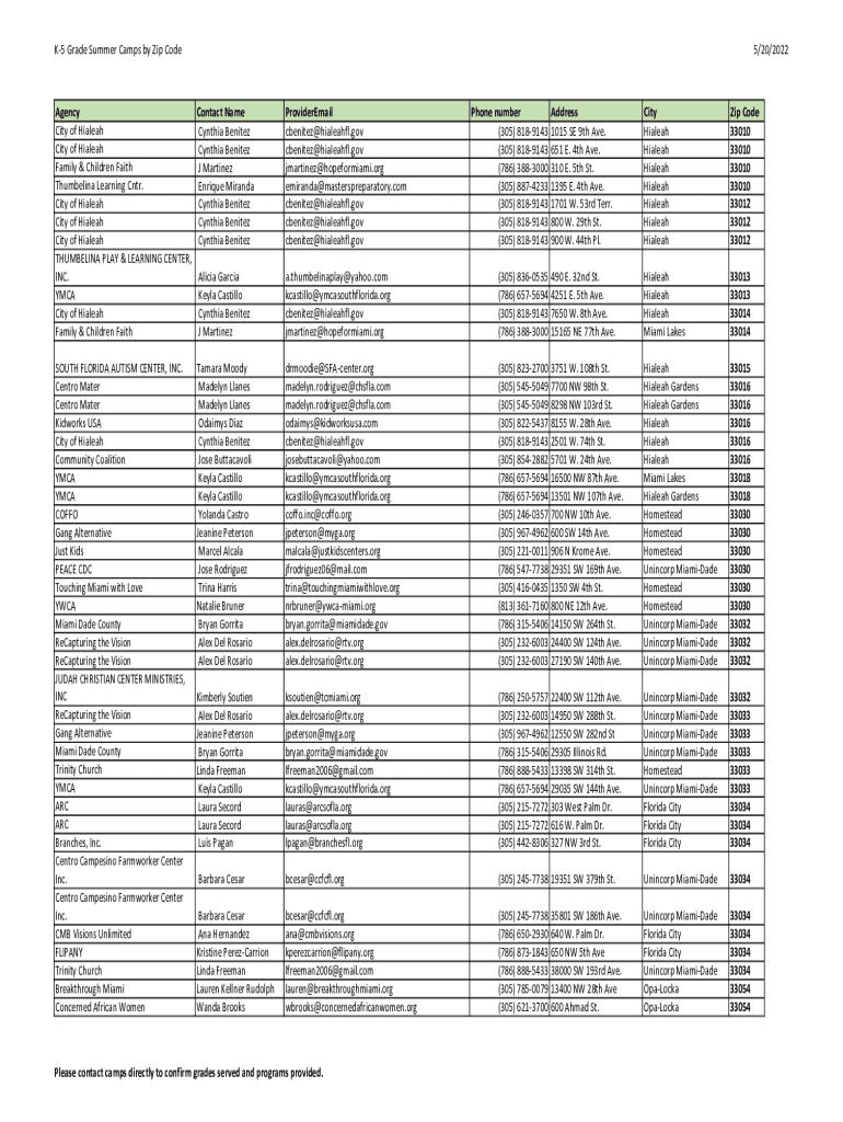 K5 Grade Summer Camps by Zip Code5/20/2022Agency City of Hialeah City of Hialeah Family & Children Faith Tumbling Learning CNR. City of Hialeah City of Hialeah City of Hialeah TUMBLING PLAY & LEARNING