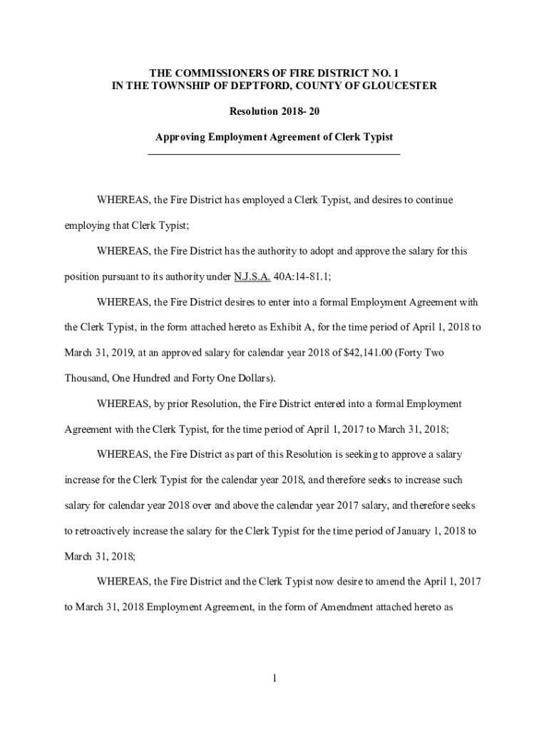THE COMMISSIONERS OF FIRE DISTRICT NO. 1 IN THE TOWNSHIP OF HARTFORD, COUNTY OF GLOUCESTER Resolution 2018 20 Approving Employment Agreement of Clerk Typist ___WHEREAS, the Fire District has employed
