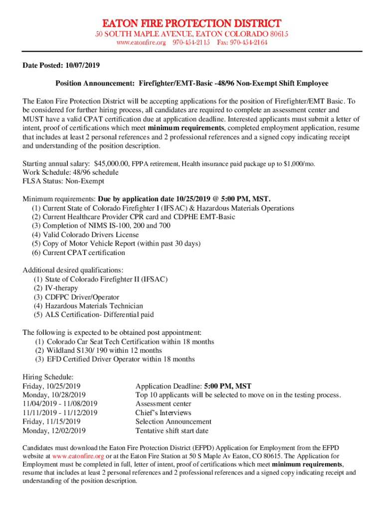 EATON FIRE PROTECTION DISTRICT 50 SOUTH MAPLE AVENUE, EATON COLORADO 80615 www.eatonfire.org9704542115 Fax: 9704542164Date Posted: 10/07/2019 Position Announcement: Firefighter/Basic 48/96 Nonexempt