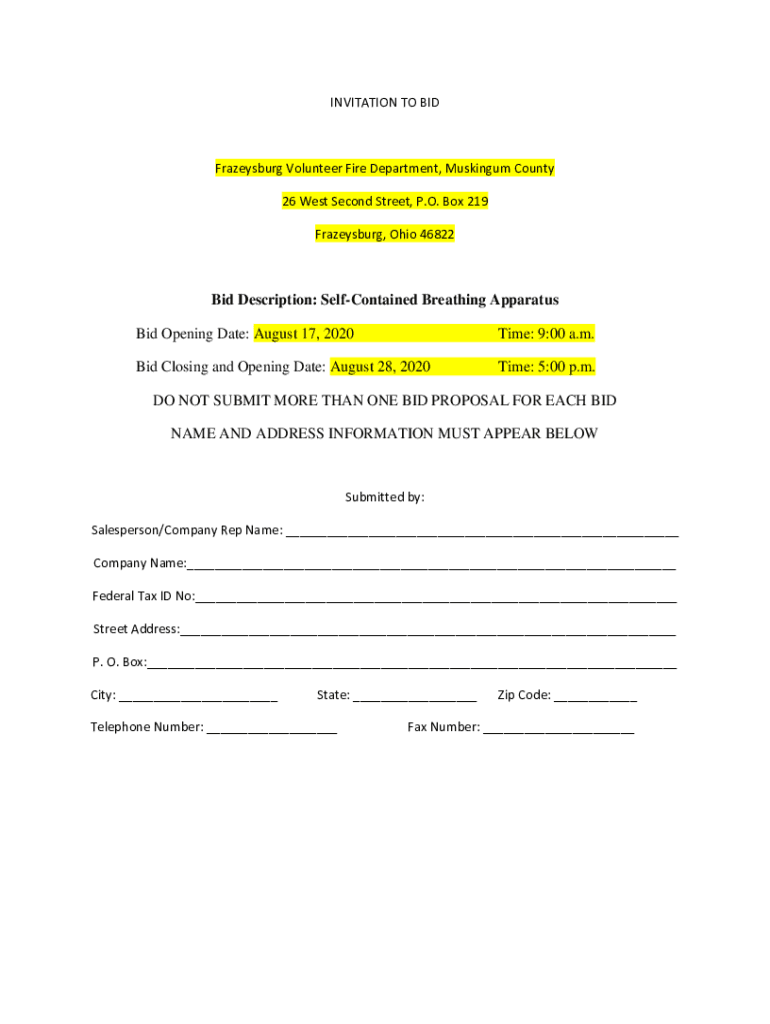 INVITATION TO BIDFrazeysburg Volunteer Fire Department, Masking County 26 West Second Street, P.O. Box 219 Frazeysburg, Ohio 46822Bid Description: SelfContained Breathing Apparatus Bid Opening Date: