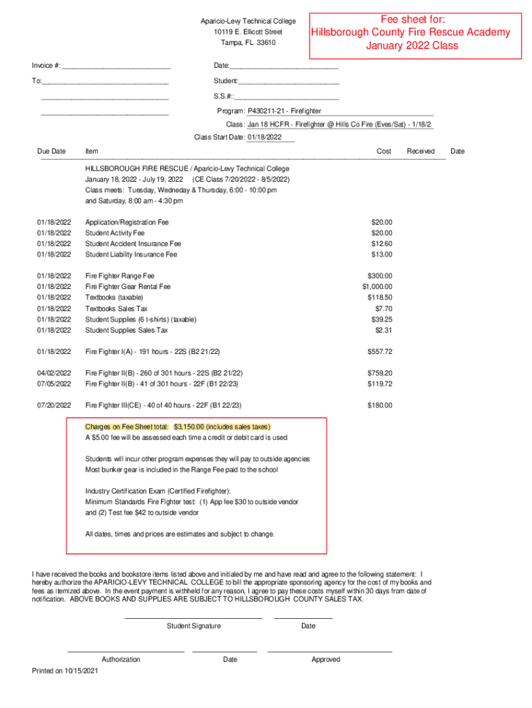 Fee sheet for: Hillsborough County Fire Rescue Academy January 2022 ClassAparicioLevy Technical College 10119 E. Ellicott Street Tampa, FL 33610 Invoice #: ___Date:___To:___Student:______S. S.#::___