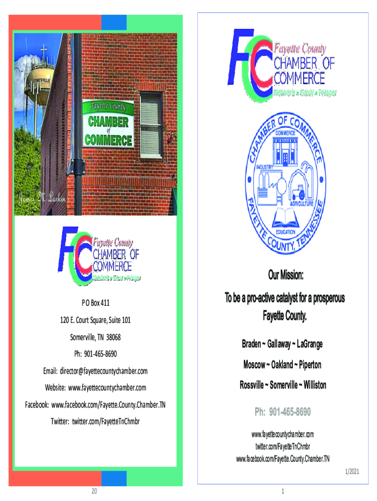 P O Box 411 120 E. Court Square, Suite 101 Somerville, TN 38068 pH: 9014658690Email: director×fayettecountychamber.com Website: www.fayettecountychamber.comBraden Galloway LaGrangeMoscow Oakland