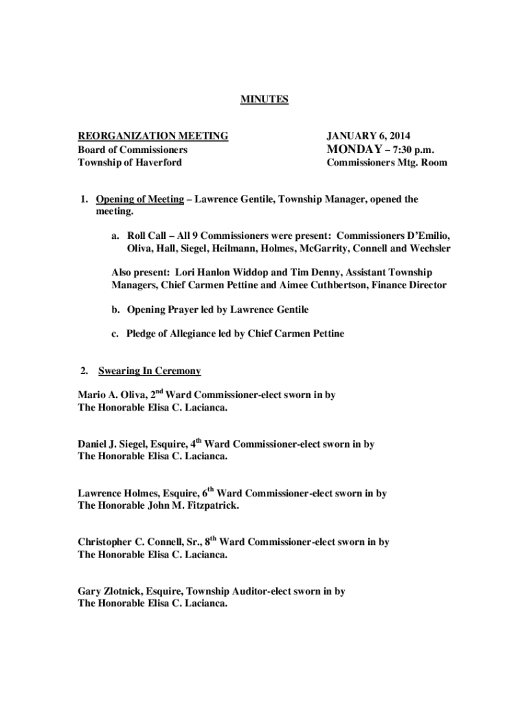 MINUTESREORGANIZATION MEETING Board of Commissioners Township of HaverfordJANUARY 6, 2014 MONDAY 7:30 p.m. Commissioners Mtg. Room1. Opening of Meeting Lawrence Gentile, Township Manager, opened the