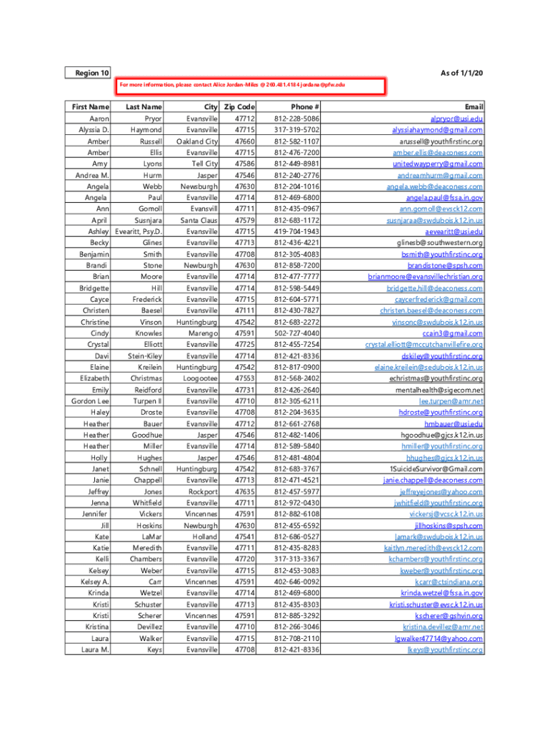 Region 10As of 1/1/20 For more information, please contact Alice Jordan Miles @ 260.481.4184 Jordana×PFC.first Nameless NameCityZip Telephone #EmailAaronPryorEvansville477128122285086alpryor×USI.eduAlyssia