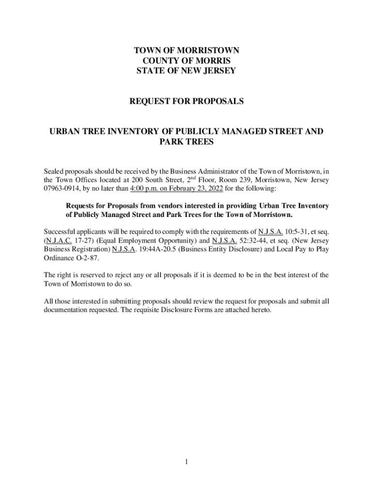 TOWN OF MORRISTOWN COUNTY OF MORRIS STATE OF NEW JERSEYREQUEST FOR PROPOSALSURBAN TREE INVENTORY OF PUBLICLY MANAGED STREET AND PARK Resealed proposals should be received by the Business Administrator