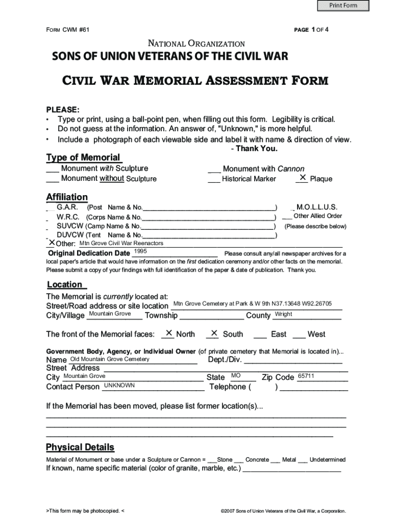 Print Former CWM #61PAGE1 OF 4NATIONAL ORGANIZATIONS ONS OF UNION VETERANS OF THE CIVIL WAR MEMORIAL ASSESSMENT FORM PLEASE: Type or print, using a ballpoint pen, when filling out this form. Legibility