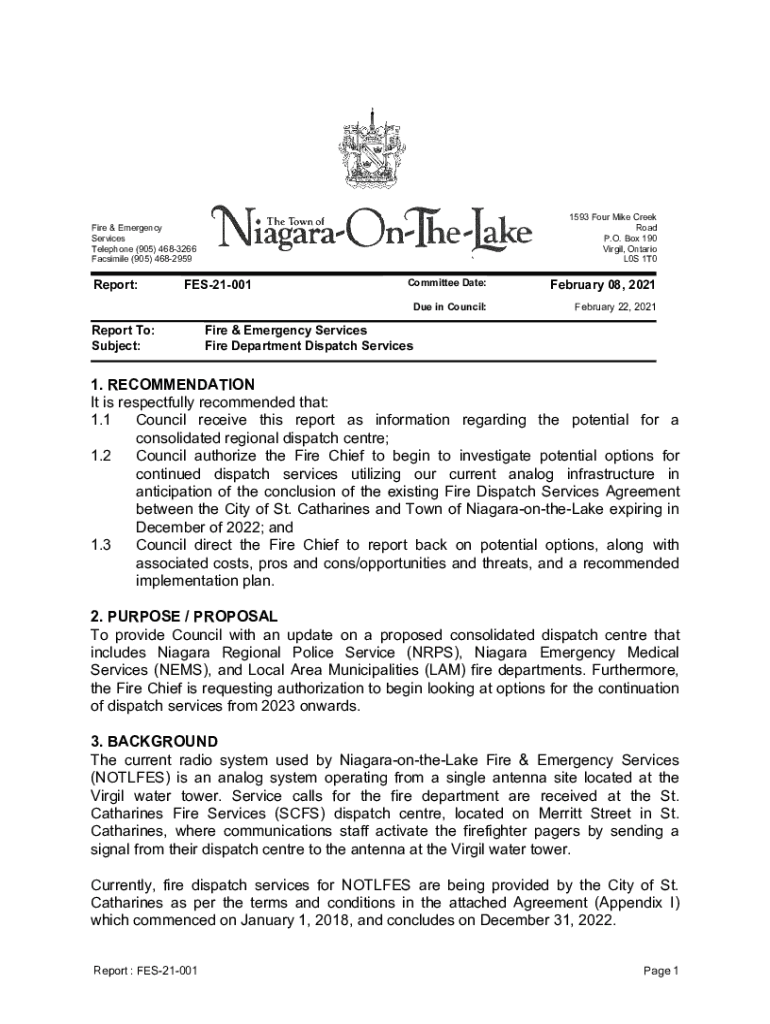 1593 Four Mike Creek Road P.O. Box 190 Virgil, Ontario L0S 1T0Fire & Emergency Services Telephone (905) 4683266 Facsimile (905) 4682959Report:FES21001Report To: Subject:Committee Date:February 08,