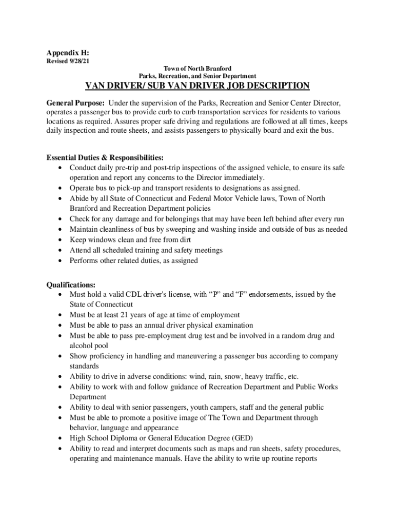 Appendix H: Revised 9/28/21 Town of North Branford Parks, Recreation, and Senior Departmental DRIVER/ SUB VAN DRIVER JOB DESCRIPTION General Purpose: Under the supervision of the Parks, Recreation