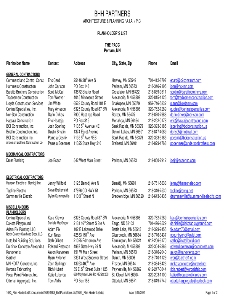 BAH, PARTNERS ARCHITECTURE & PLANNING / A.I.A. / P.C. LANDHOLDERS LIST THE PACE Per ham, MN Plan holder NameContactAddressCity, State, ZipPhoneEmailAnderson Brothers Construction Cleric Card John