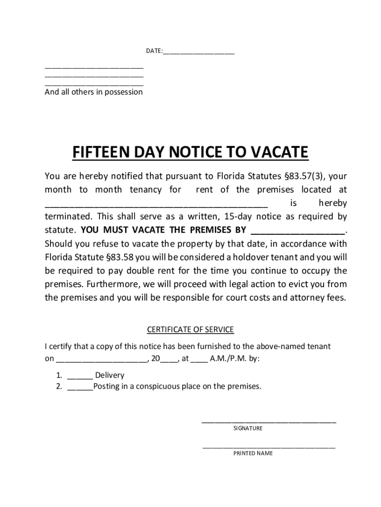 DATE:___ ___ ___ ___And all others in possessionFIFTEEN DAY NOTICE TO VACATE You are hereby notified that pursuant to Florida Statutes 83.57(3), your month-to-month tenancy for rent of the premises