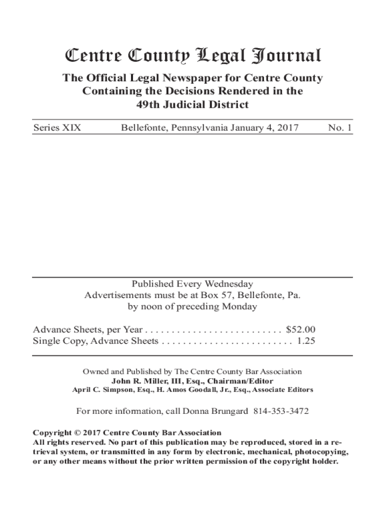 Center County Legal Journalese Official Legal Newspaper for Center County Containing the Decisions Rendered in the 49th Judicial DistrictSeries XIXBellefonte, Pennsylvania January 4, 2017No. 1Published