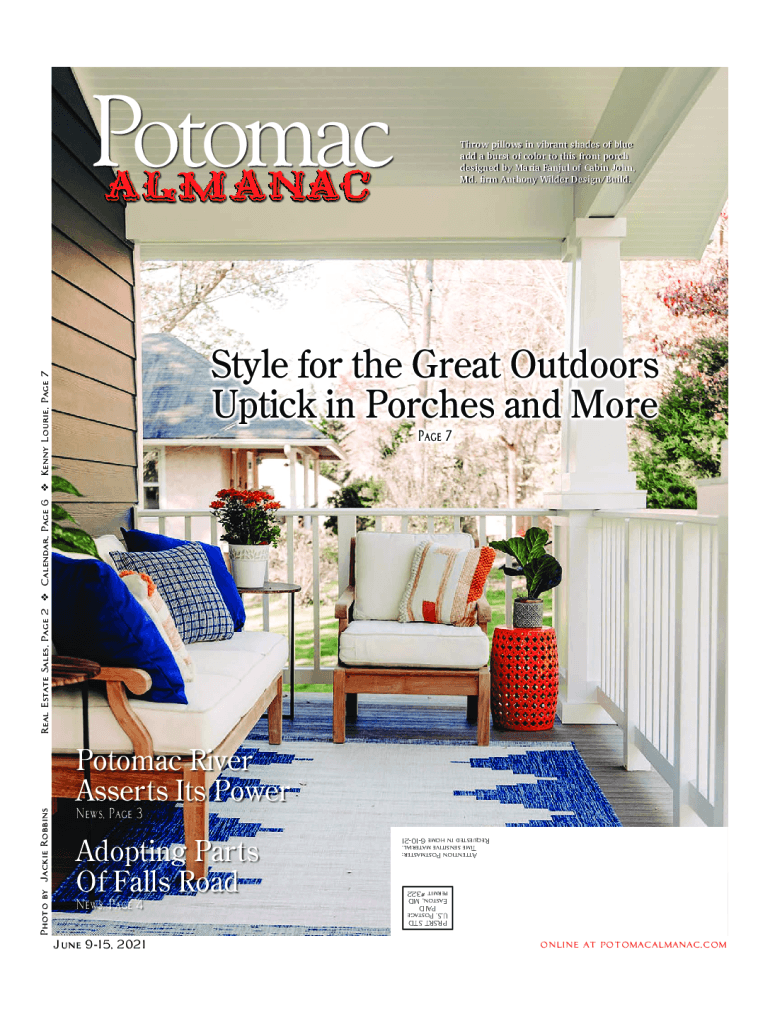 Throw pillows in vibrant shades of blue add a burst of color to this front porch designed by Maria Banjul of Cabin John, Md. firm Anthony Wilder Design/Build.Real Estate Sales, Page 2 v Calendar,