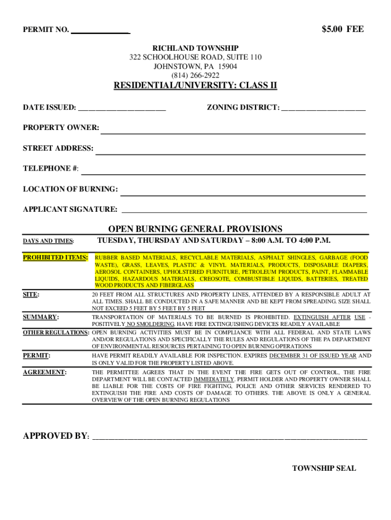 Visit the Richland Township website to obtain the PA Residential Burning Permit application form.