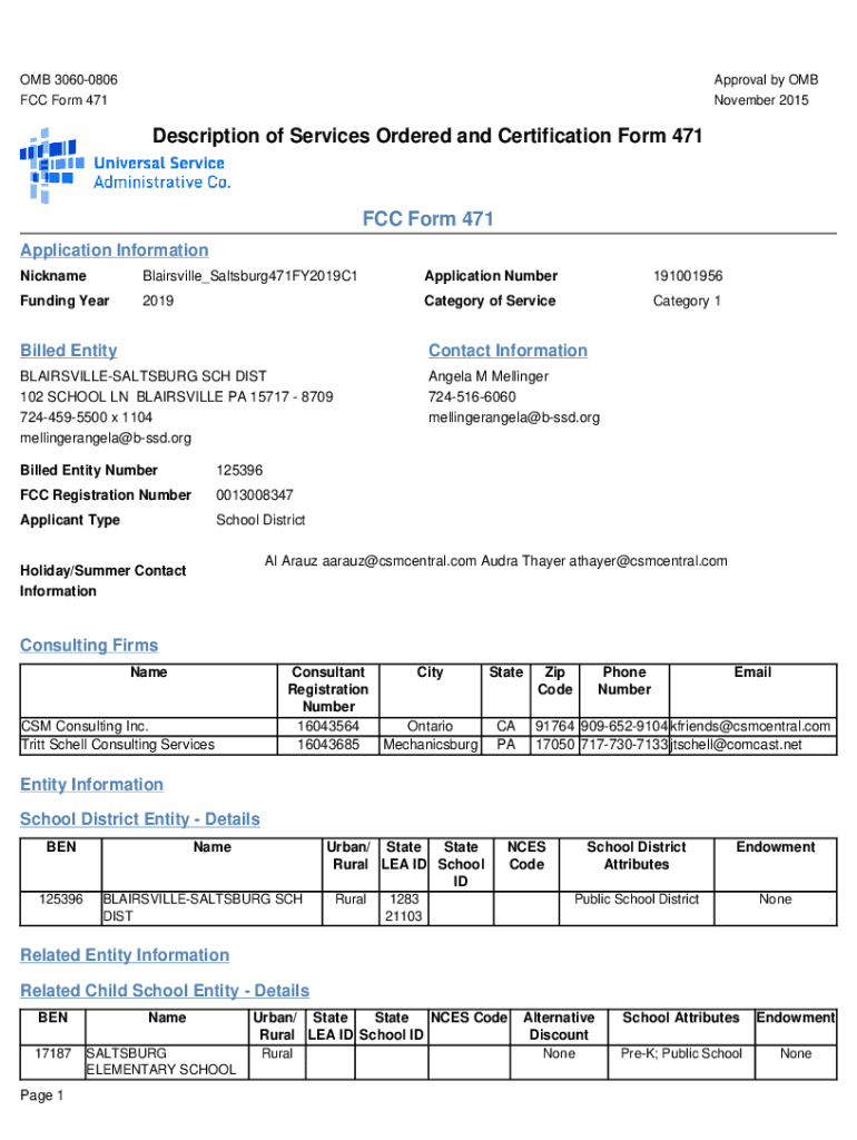 OMB 30600806 FCC Form 471Approval by OMB November 2015Description of Services Ordered and Certification Form 471FCC Form 471 Application Information NicknameBlairsville×Saltsburg471FY2019C1Application