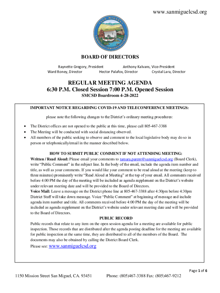 WWW.sanmiguelcsd.onboard OF DIRECTORS Annette Gregory, President Anthony Balkans, VicePresident Ward Money, Director Hector Paradox, Director Crystal Lara, DirectorREGULAR MEETING AGENDA 6:30 P.M.