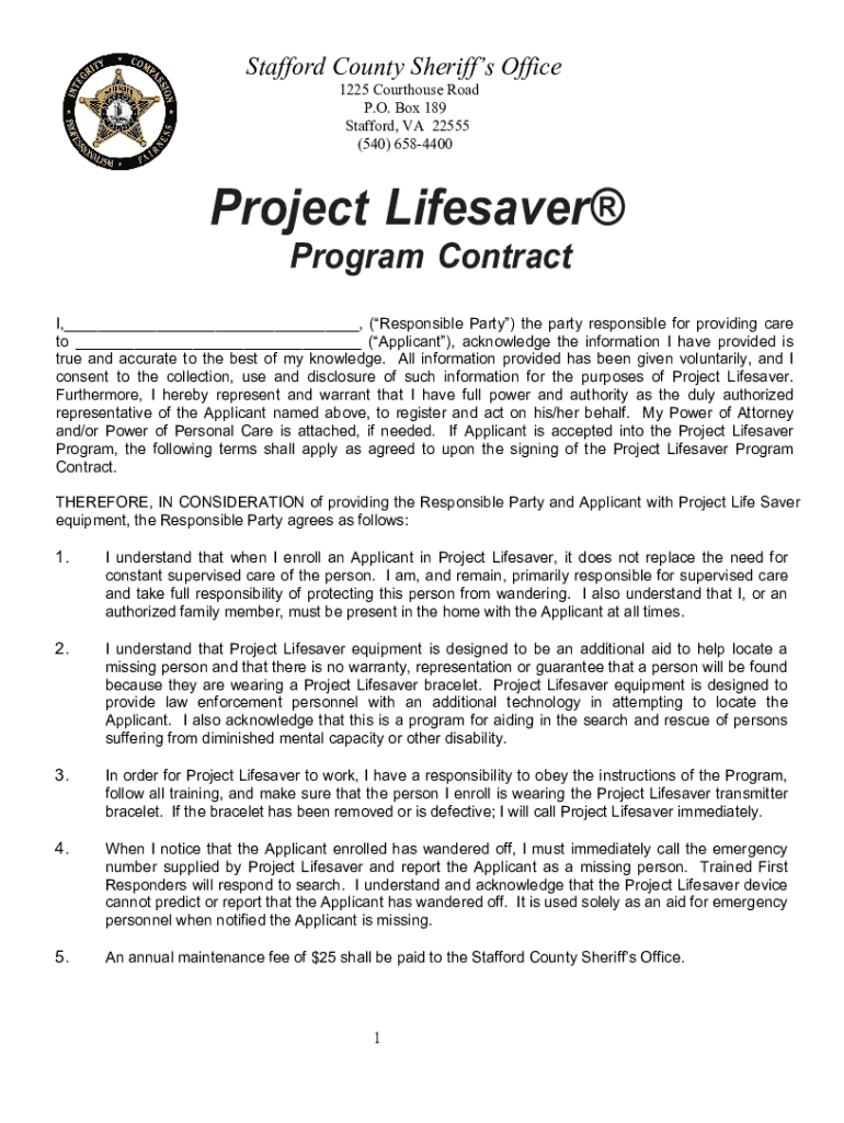 Stafford County Sheriffs Office 1225 Courthouse Road P.O. Box 189 Stafford, VA 22555 (540) 6584400Project Lifesaver Program Contract I, *__, (Responsible Party) the party responsible for providing