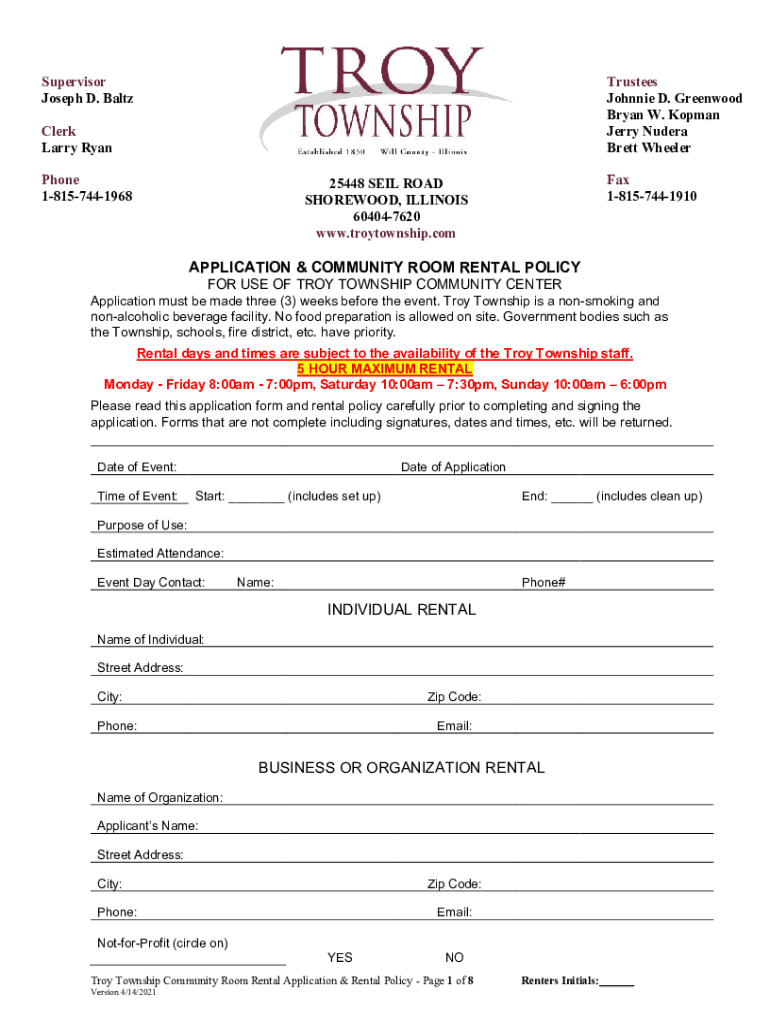 Get the free APPLICATION & COMMUNITY ROOM RENTAL POLICY FOR USE OF TROY ...