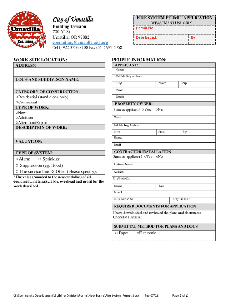 City of UmatillaFIRE SYSTEM PERMIT APPLICATION DEPARTMENT USE ONLY Permit No:Building Division 700 6th St Matilda, OR 97882 permitting×umatillacity.ornate Issued:By:(541) 9223226 x108 Fax (541) 9225758WORK