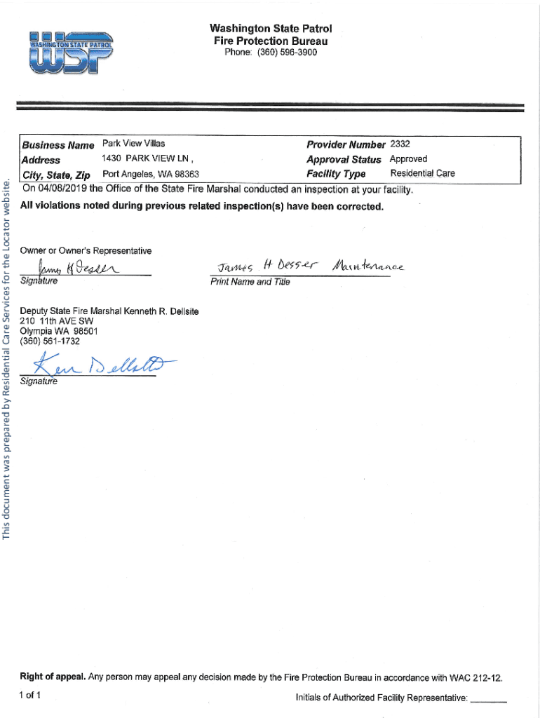 This document was prepared by Residential Care Services for the Locator website. Washington State Patrol Fire Protection Bureau Phone: (360)5963900Business Name Park View VillasProvider Number 2332Address1430