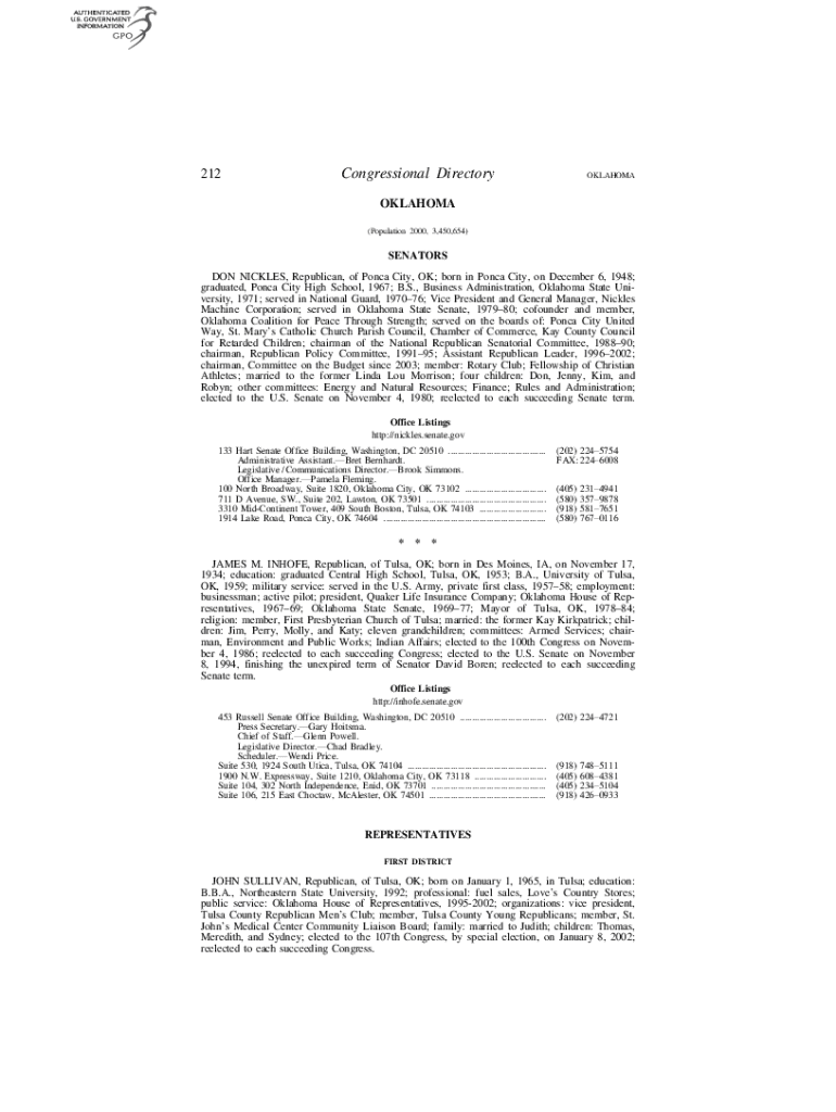 212Congressional DirectoryOKLAHOMAOKLAHOMA (Population 2000, 3,450,654)SENATORS DON NICKLES, Republican, of Ponca City, OK; born in Ponca City, on December 6, 1948; graduated, Ponca City High School,
