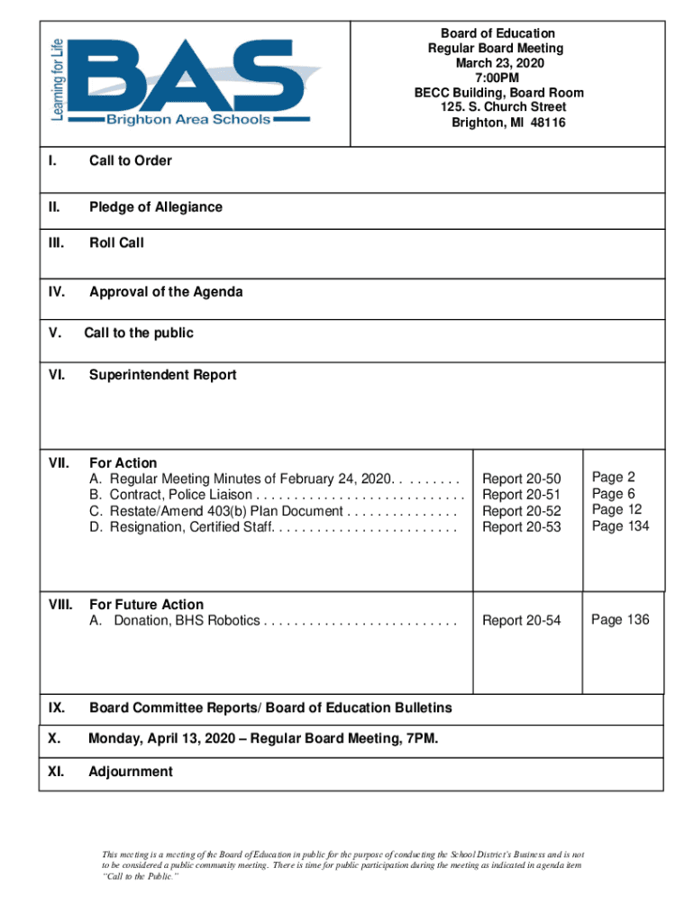 Board of Education Regular Board Meeting March 23, 2020 7:00PM BECK Building, Board Room 125. S. Church Street Brighton, MI 48116I. Call to Order. Pledge of Allegiance. Roll Callie. Approval of the
