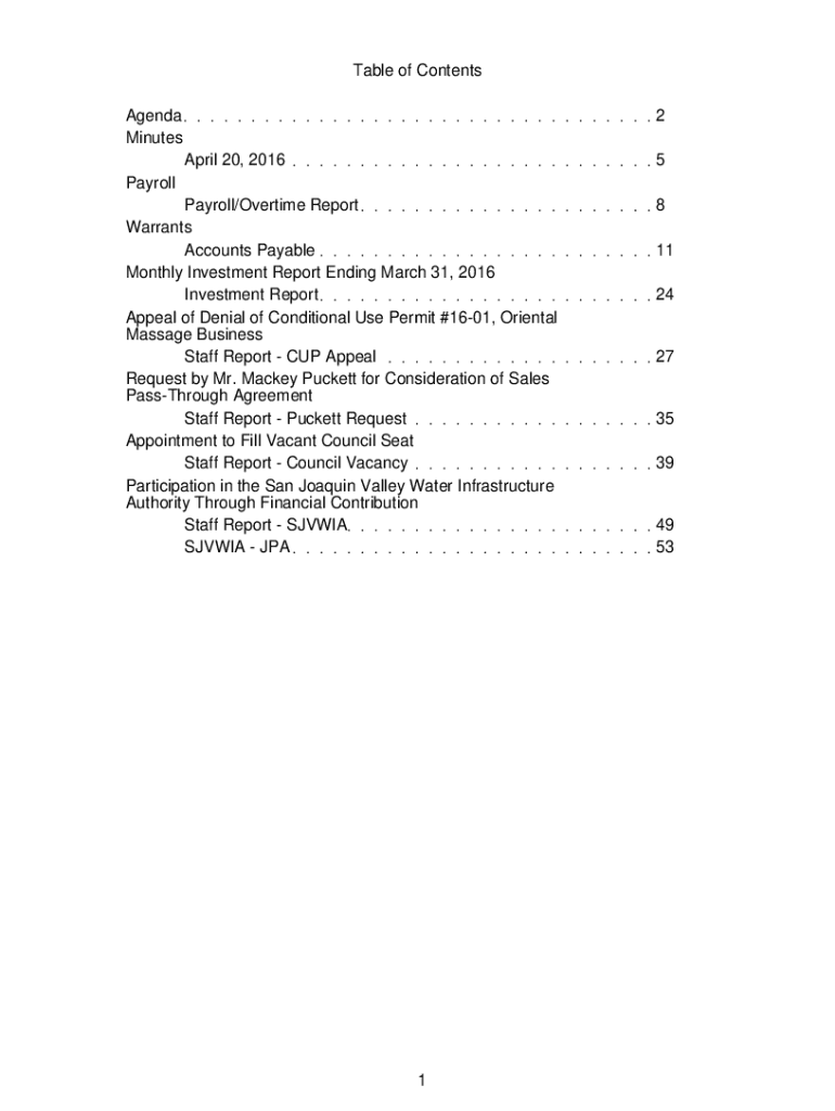 Table of Contents Agenda Minutes2 April 20, 20165Payroll Payroll/Overtime Report Warrants Accounts Payable Monthly Investment Report Ending March 31, 2016, Investment Report Appeal of Denial of Conditional