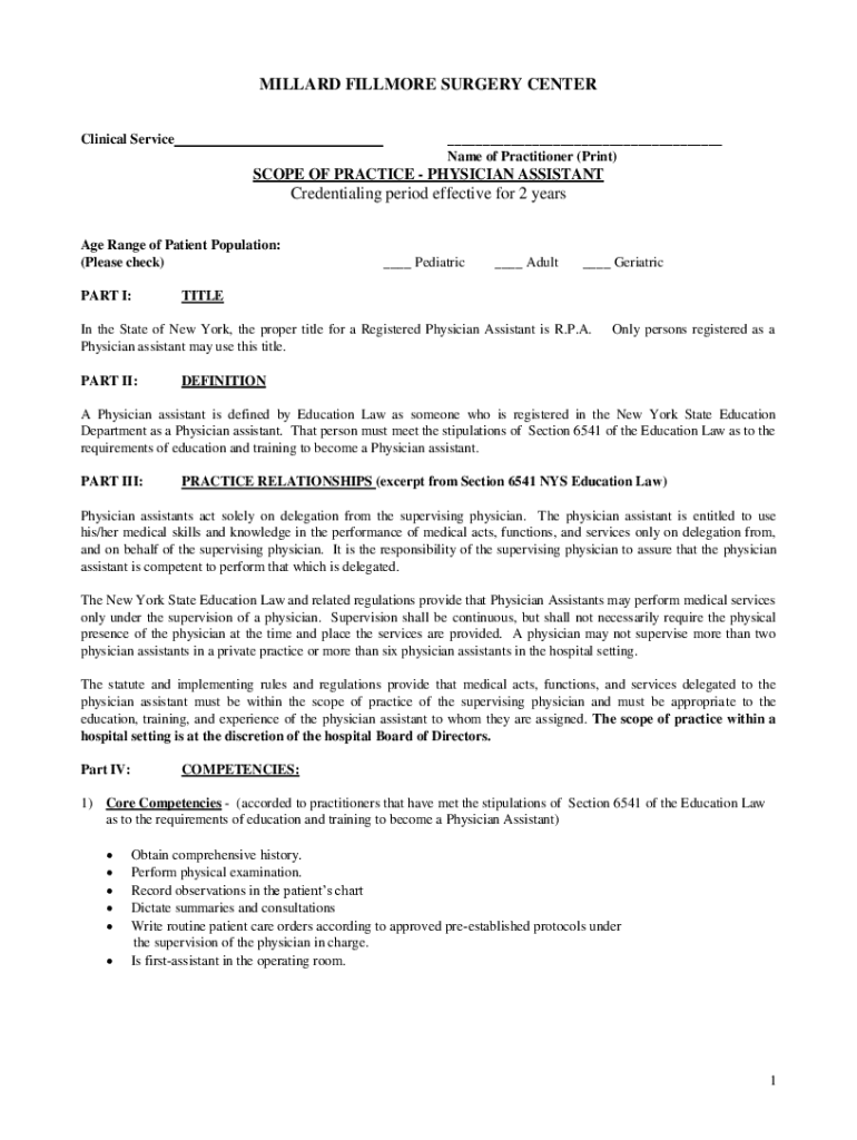 MILLARD FILLMORE SURGERY CENTER Clinical Service___ Name of Practitioner (Print)SCOPE OF PRACTICE PHYSICIAN ASSISTANTCredentialing period effective for 2 years Age Range of Patient Population: (Please