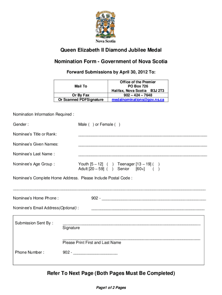 Queen Elizabeth II Diamond Jubilee Medal Nomination Form Government of Nova Scotia Forward Submissions by April 30, 2012, To: Mail To Or By Fax Or Scanned PDFSignatureOffice of the Premier PO Box